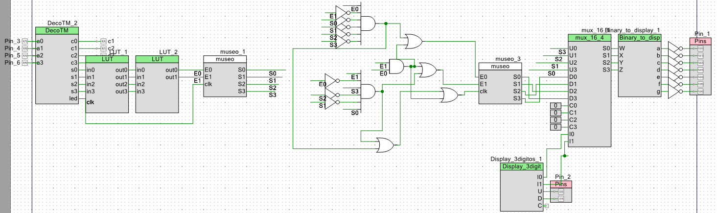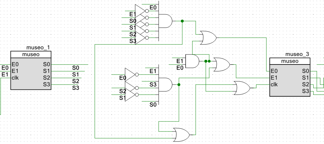 donde el contador de la izquierda (museo_1) es el contador de las unidades y el contador de la derecha (museo_3) es el contador de la decenas el cual tiene conectadas a las entradas un circuito que permite detectar cuando se tiene que incrementar el conteo para las decenas.
