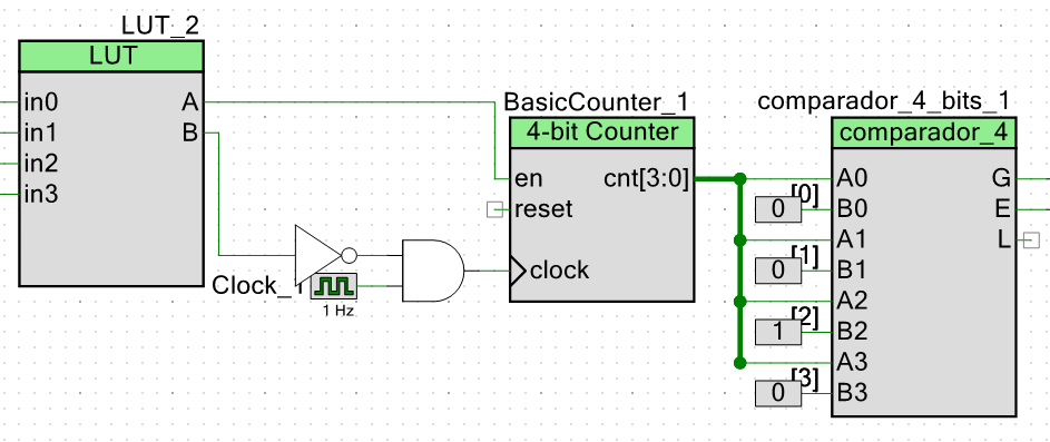 para implenentar lo anterio se tuvo que hacer un comparador que compare el tiempo que se demoro el objeto del sensor A hasta el sensor B comparado con 4 segundos. cabe mencionar que la frecuencia del reloj conectada al contador es de 1hz.
