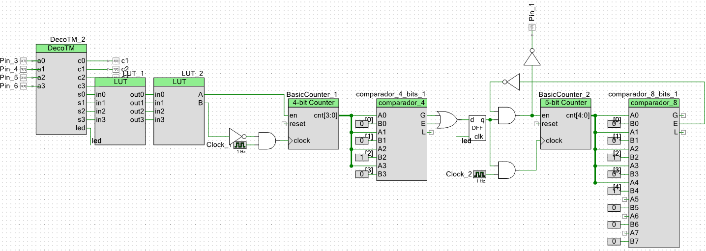 Si se da el caso en el que el objeto lleve una velocidad mayor a 54km/h se va ha encender un led que dure 20 segundos encendisodos, para esto tambien se procedio a hacer un conteo hasta 20 segundos con un contador de 5bits el cual esta conectado a un comparador dos magnitud. La conexion final de los bloques queda de la siguiente manera: