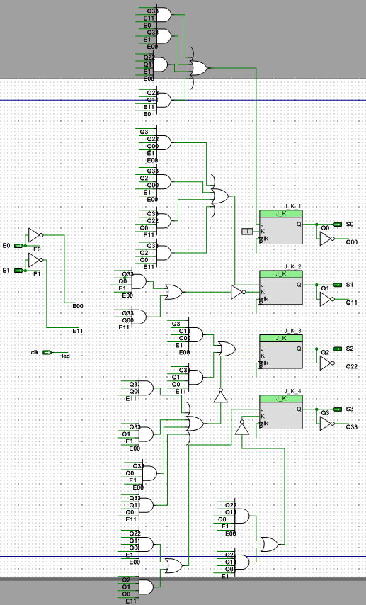 Se realizo el planteamiento para los posibles estados de este contador (en total 10) y se procedio a diseñar el circuito combinacional con fliflops JK. cabe resaltar que las reducciones de las ecuaciones se realizaron con mapas de karnaugh.