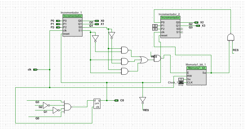 De forma idéntica, se usa otro elemento importante usado en clase que es una memoria de un bit que me sirve en este caso, como un camino del «Carrier» de un contador a otro.